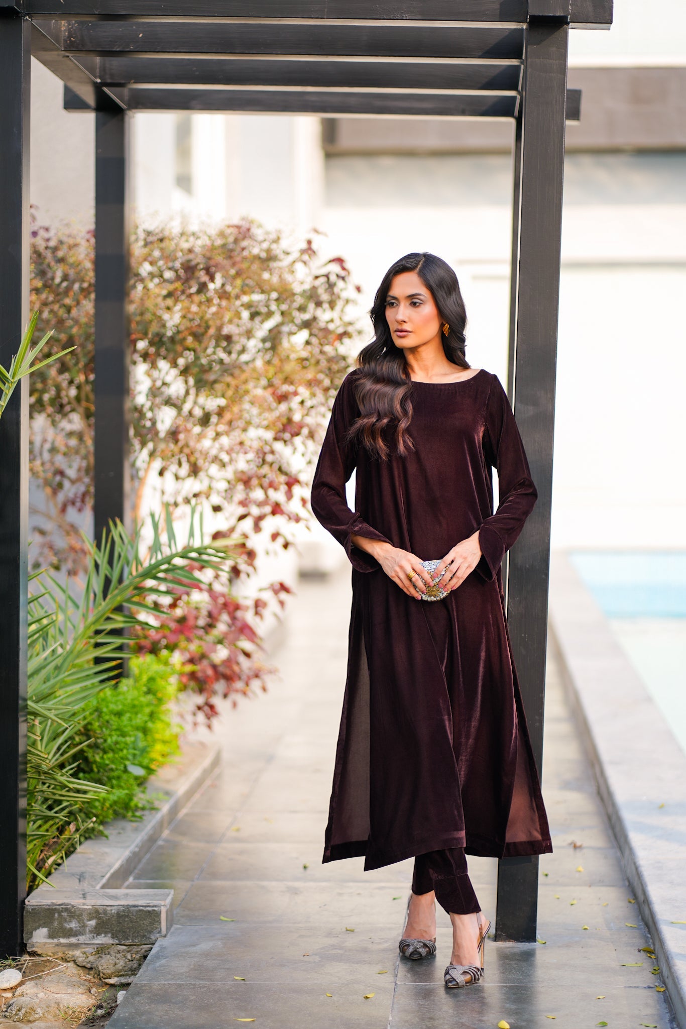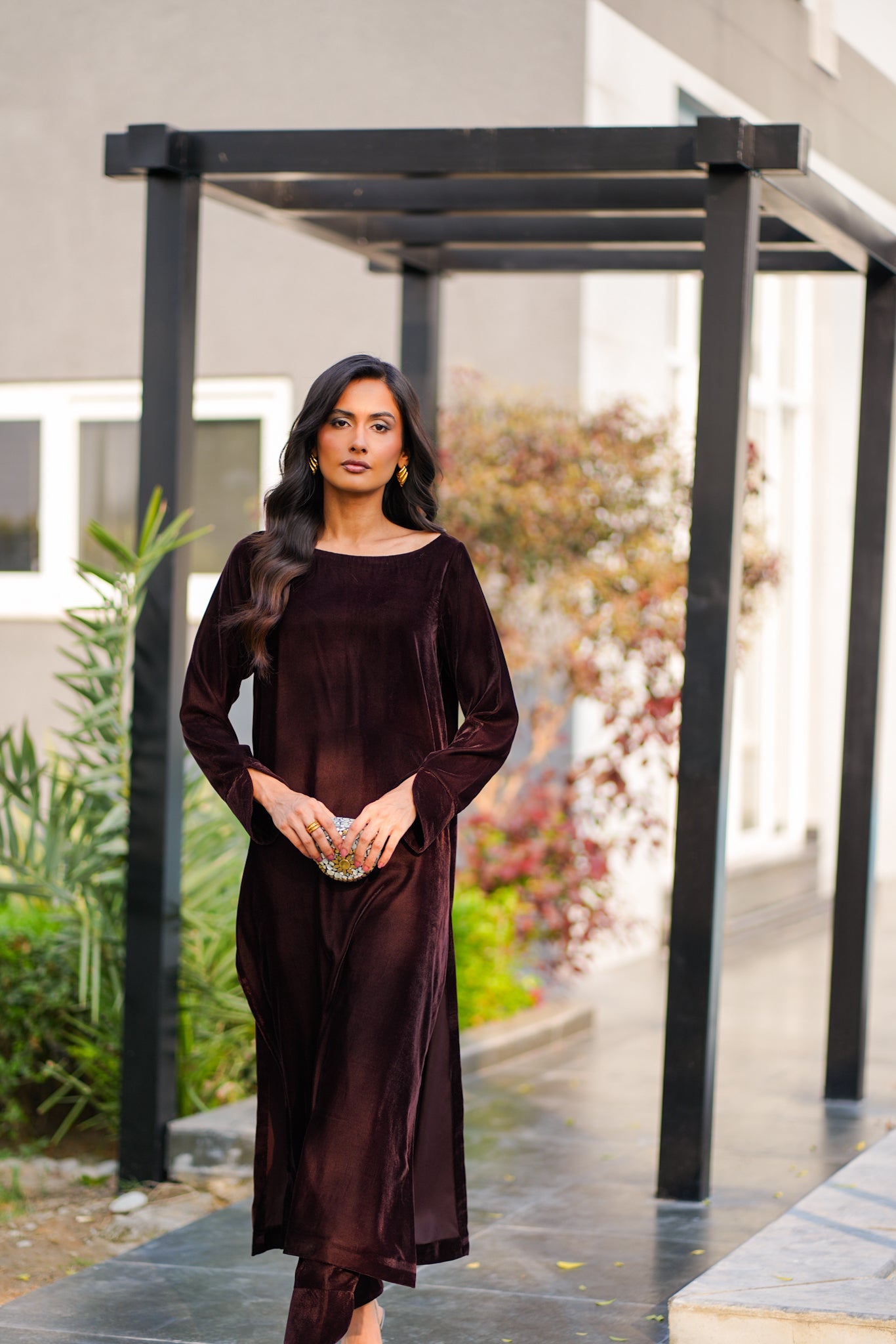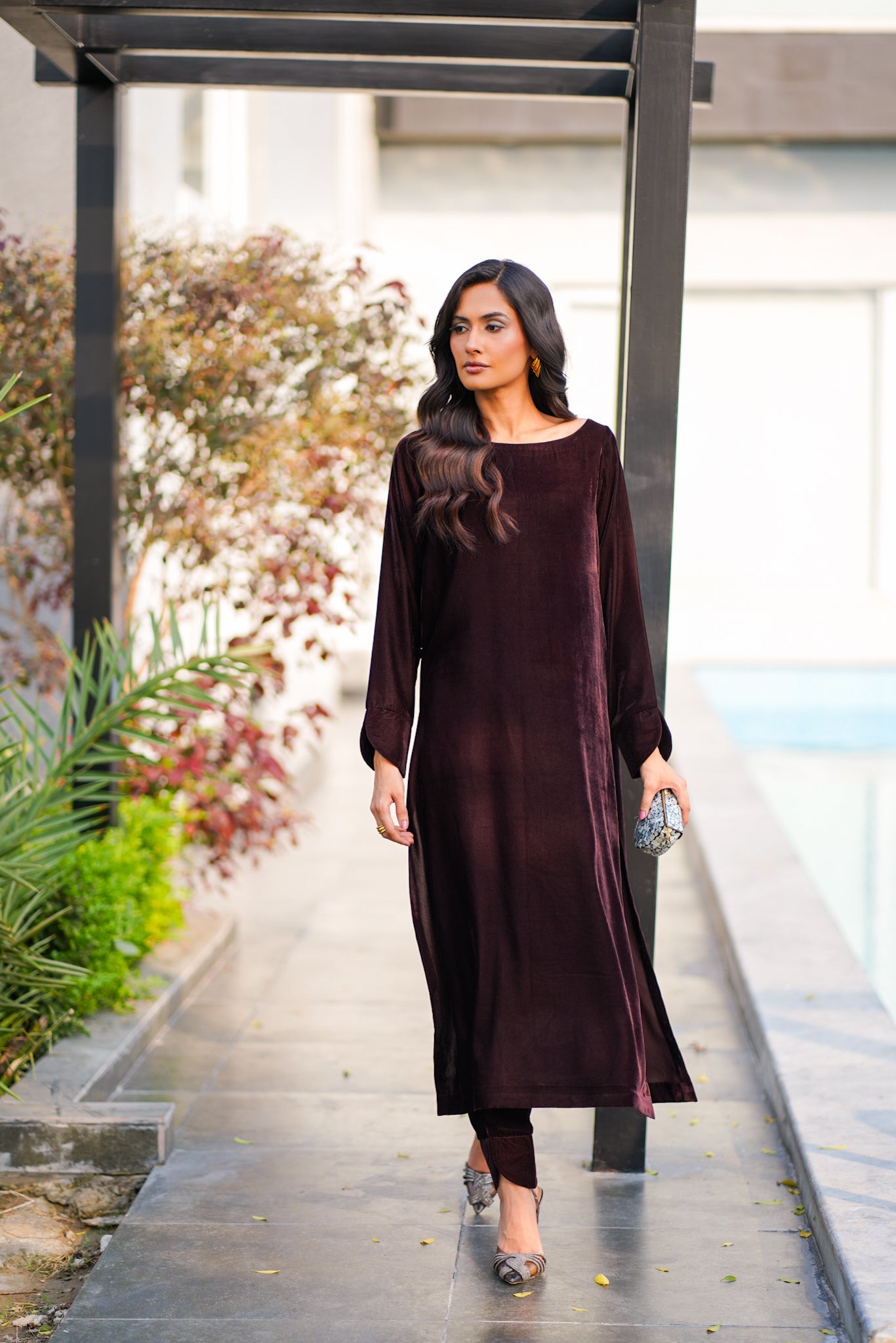 Step into timeless elegance with this Chocolate Velvet Coord Set, designed for refined sophistication and comfort. Crafted from rich velvet, this luxurious ensemble features a sleek loose-cut kurta with elegant sleeve detailing and matching trousers adorned with delicate finishing at the hem.