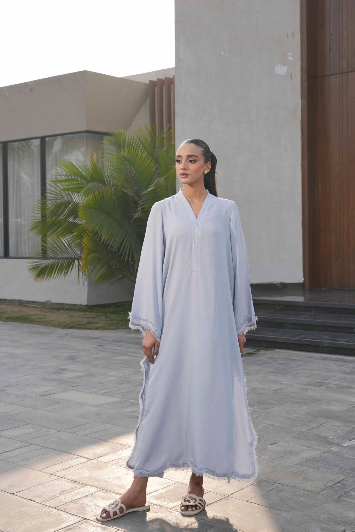 Crafted from lightweight Karandi fabric, this dress offers a soft, breathable feel with a graceful drape. The design is finished with delicate scalloped detailing and a fringed daman, adding subtle texture and an elegant, refined touch.